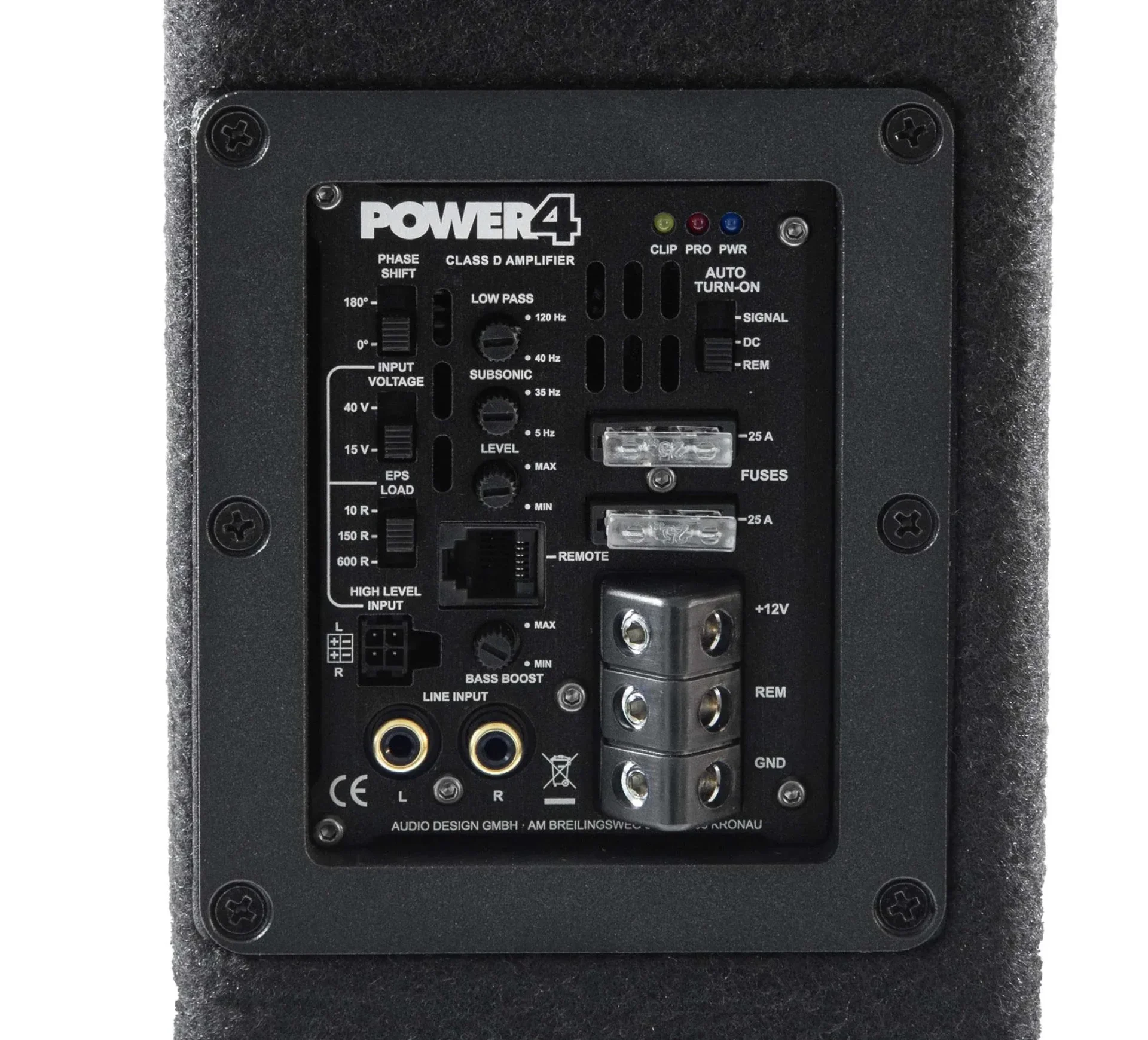 • Phase switch 0°/180° • Bass boost 0-6 dB @ 45 Hz